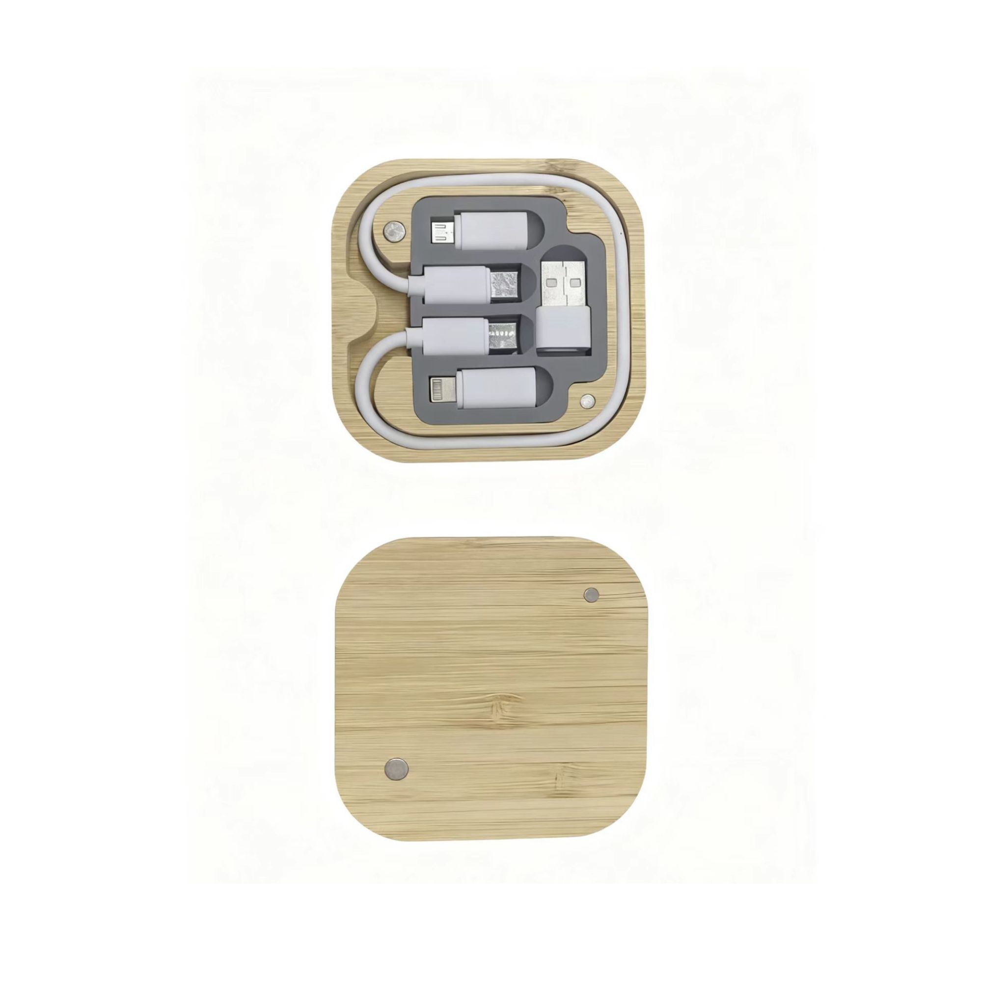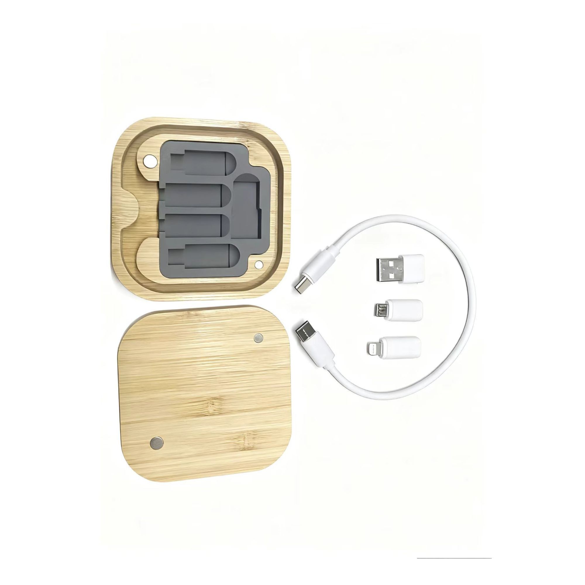 Keep your devices powered anywhere with this bamboo cable kit. Includes a Type-C cable plus adapters for Lightning, Micro, and USB-A connections, all stored in a compact keychain case. Works with most smartphones and tablets for charging or data transfer.