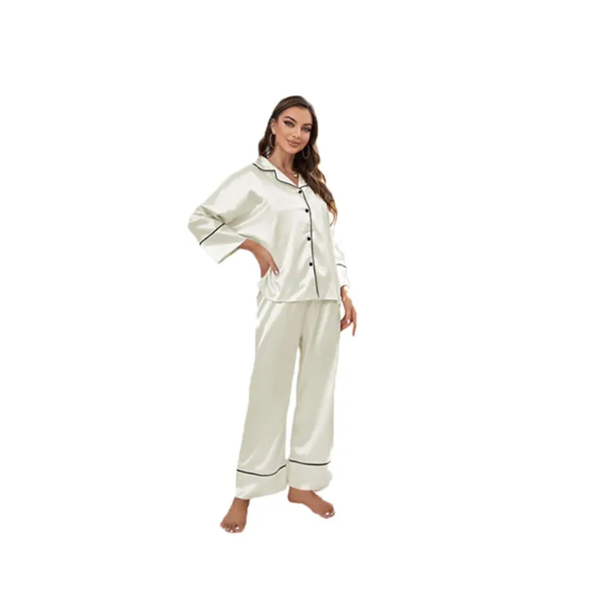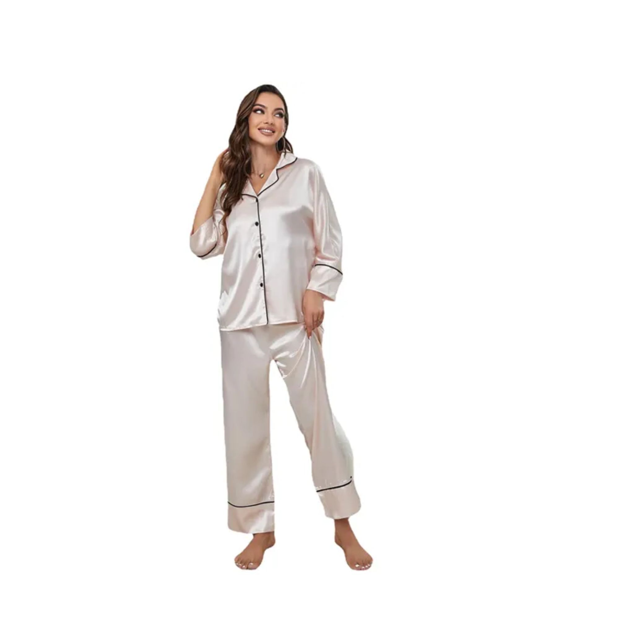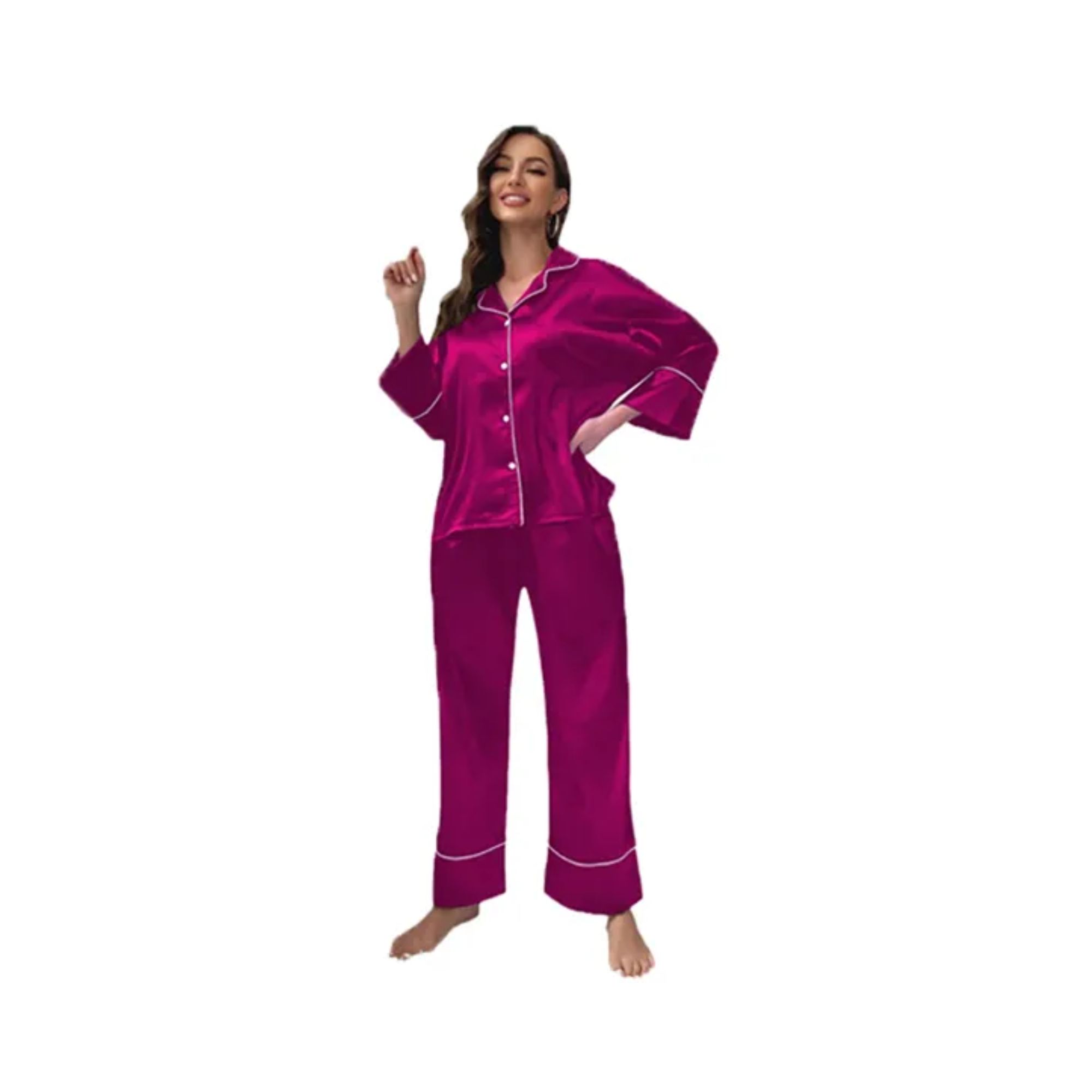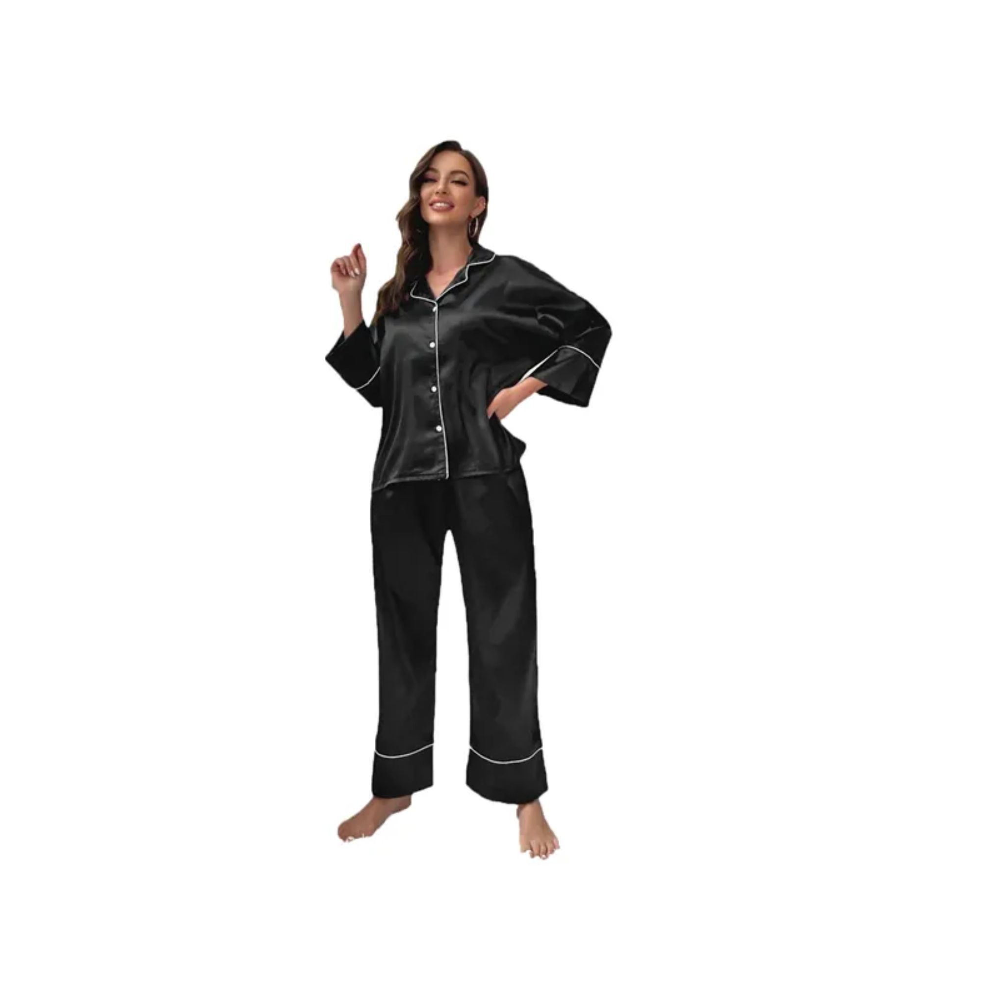 Relax in style with this two-piece silky pajama set. The long-sleeve V-neck top features a notch collar, a chest pocket, and a button-front design, while the matching pants have an elastic waistband for added comfort. Soft and elegant, this set is perfect for lounging at home, sleepovers, bridal mornings, or everyday sleepwear.